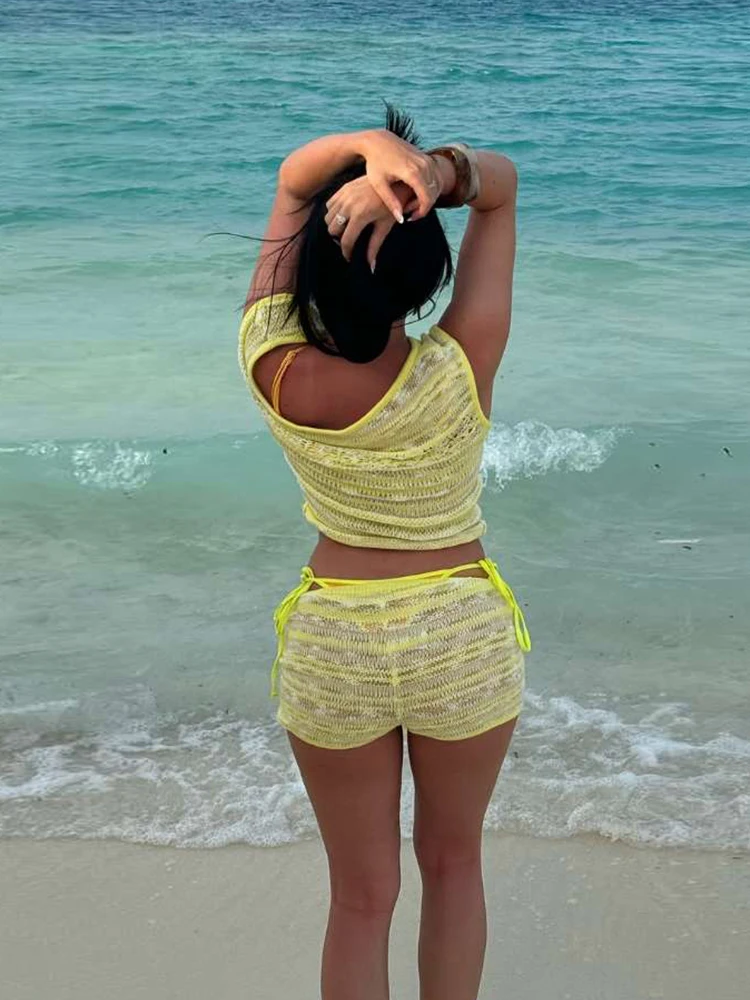Summer Crochet Women 2 Piece Set Thin Sexy Beach Vacation Tank Tops Shorts Set Outfits